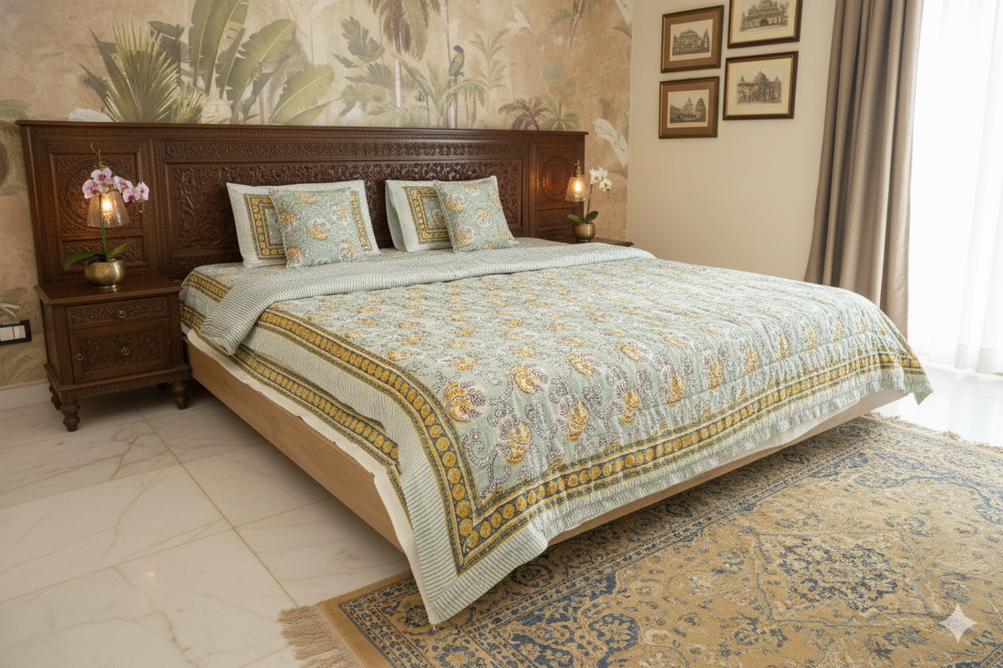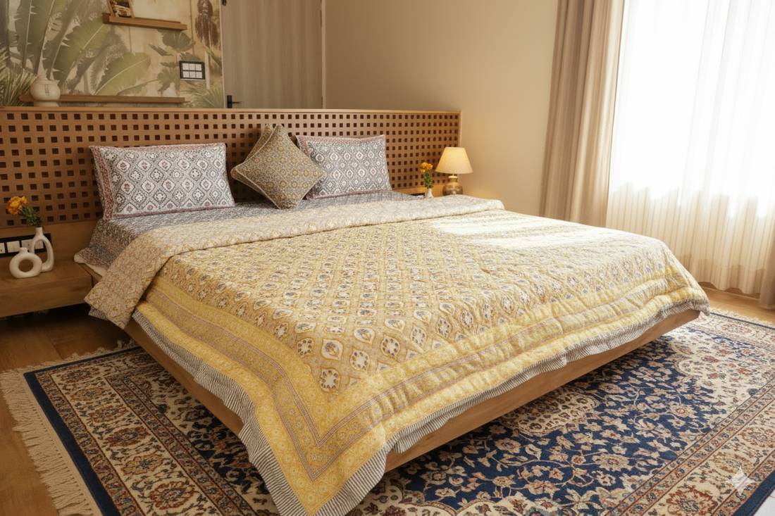 Gulmohar Bedding Collection Set of 6 (1 Bedcover, 2 Pillow cover, 1 Quilt, 2 Cotton cushion covers)
