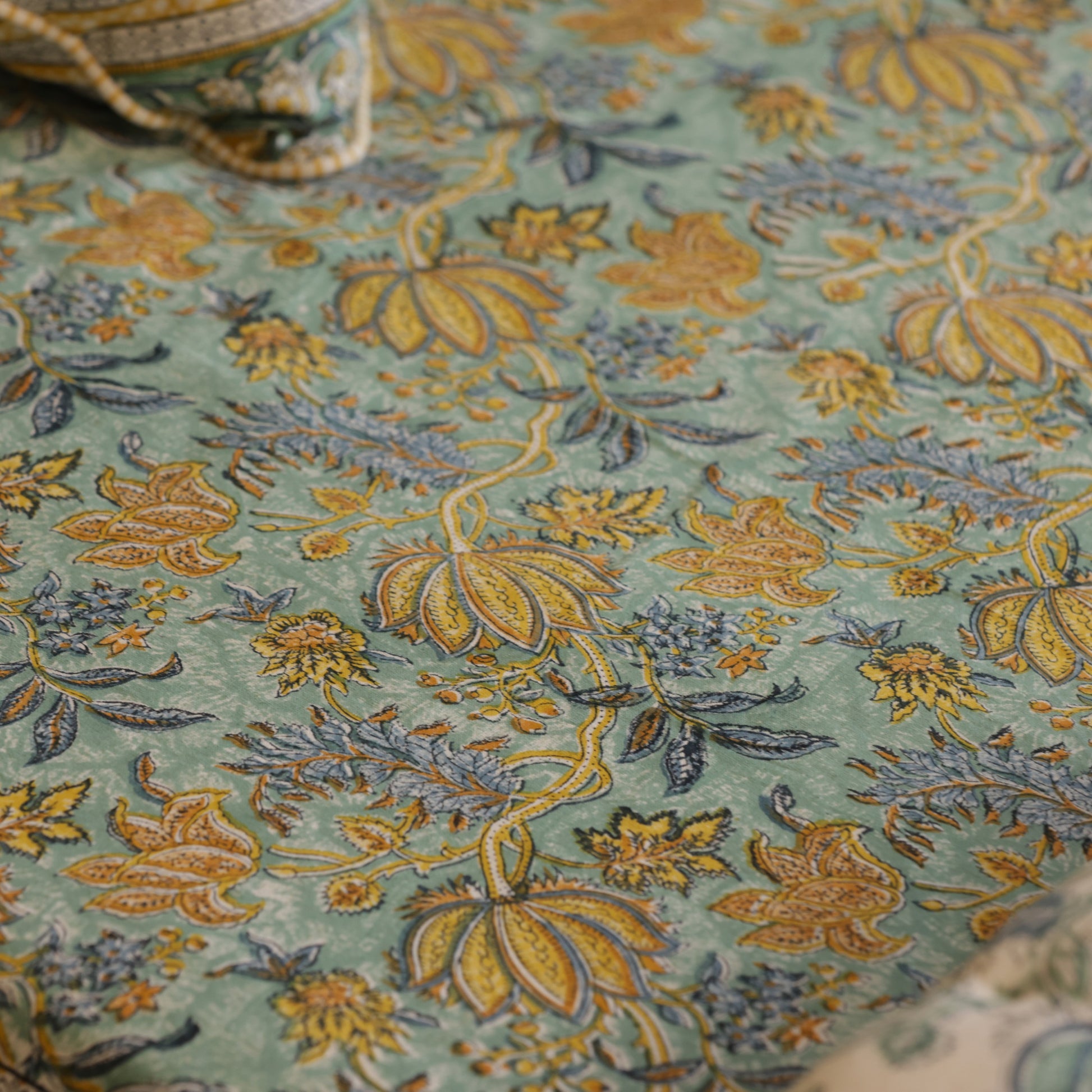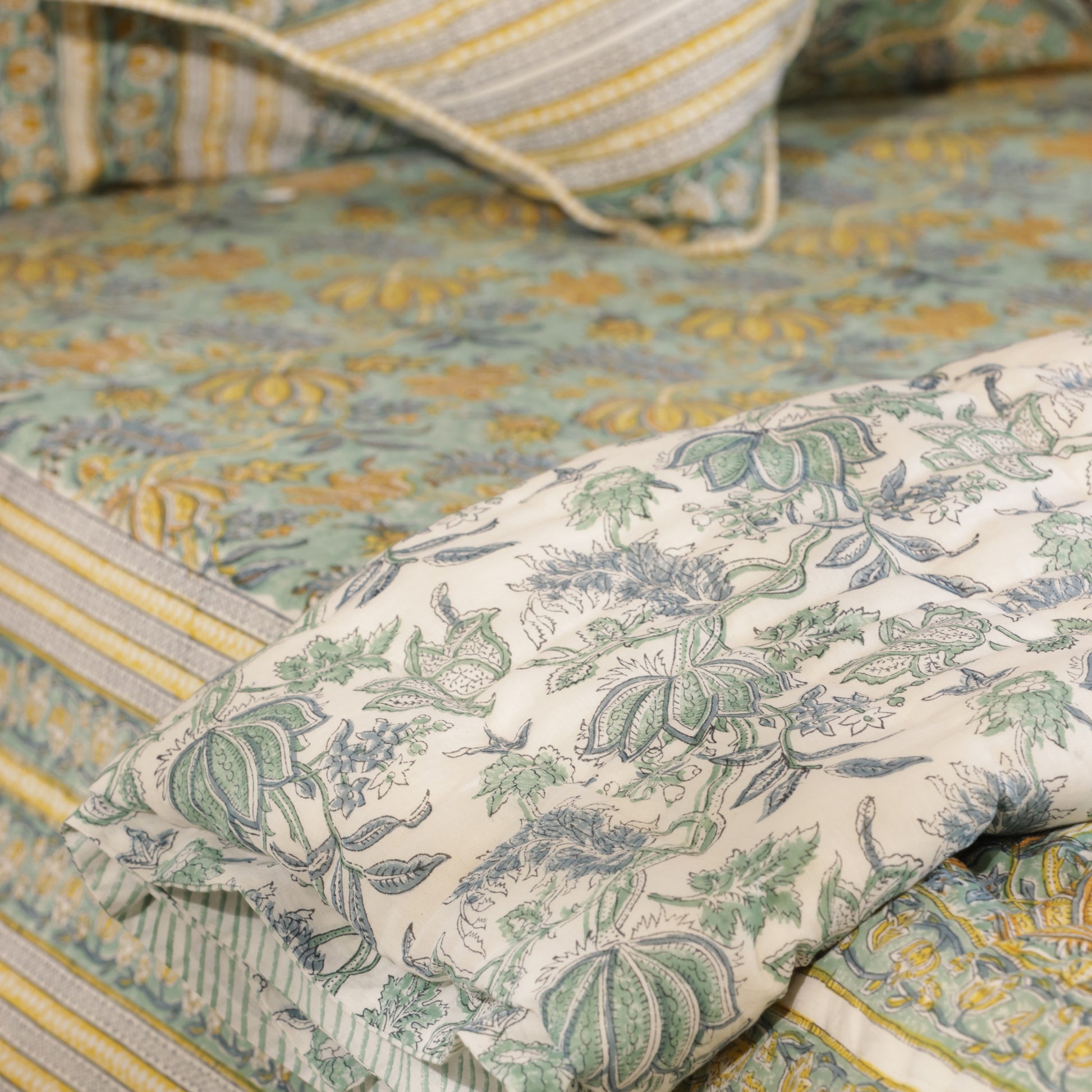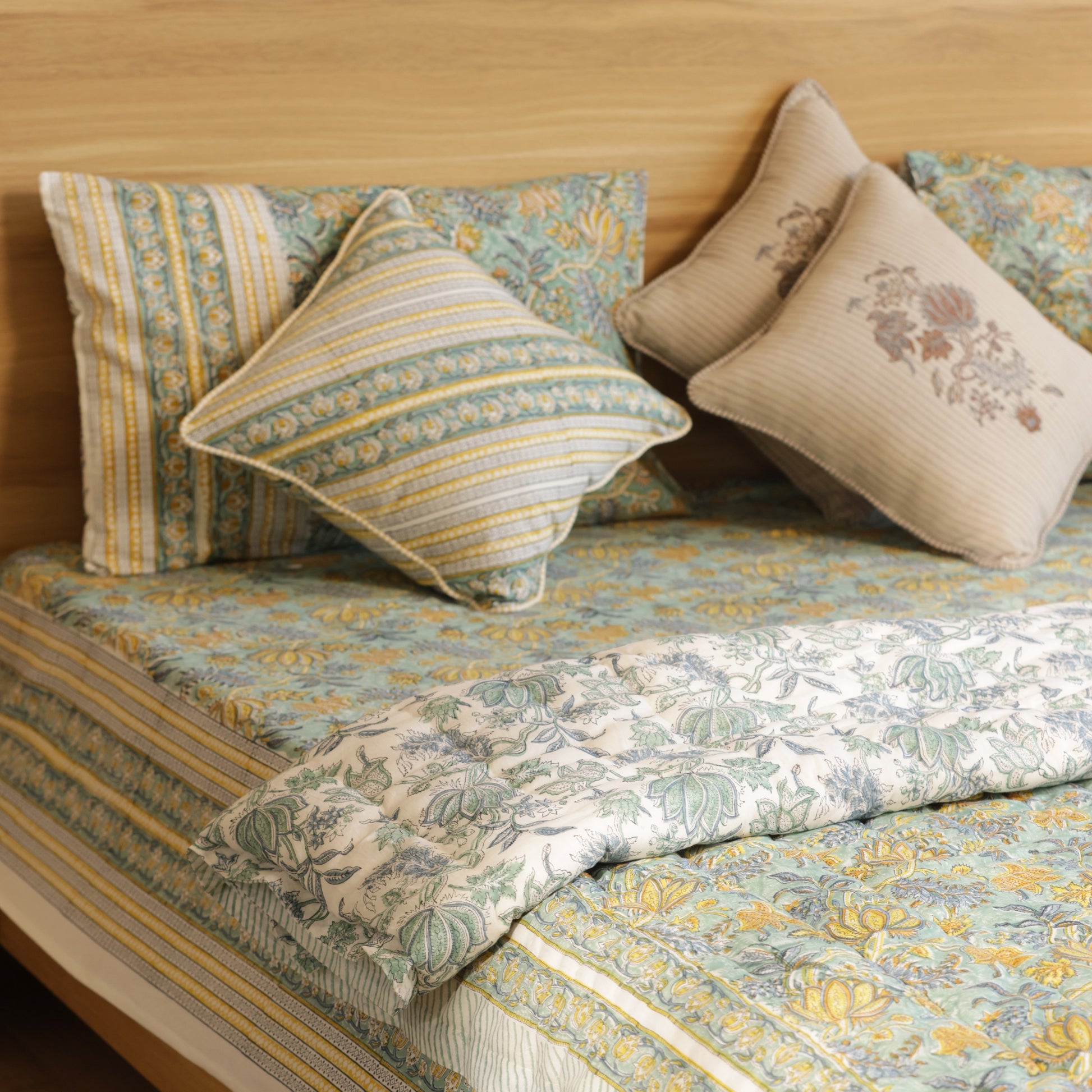 Green Lotus Bedding Collection Set of 8 (1 Bedcover, 2 Pillow cover, 1 Quilt, 2 Cotton cushion covers, 2 Linen Cushion covers)