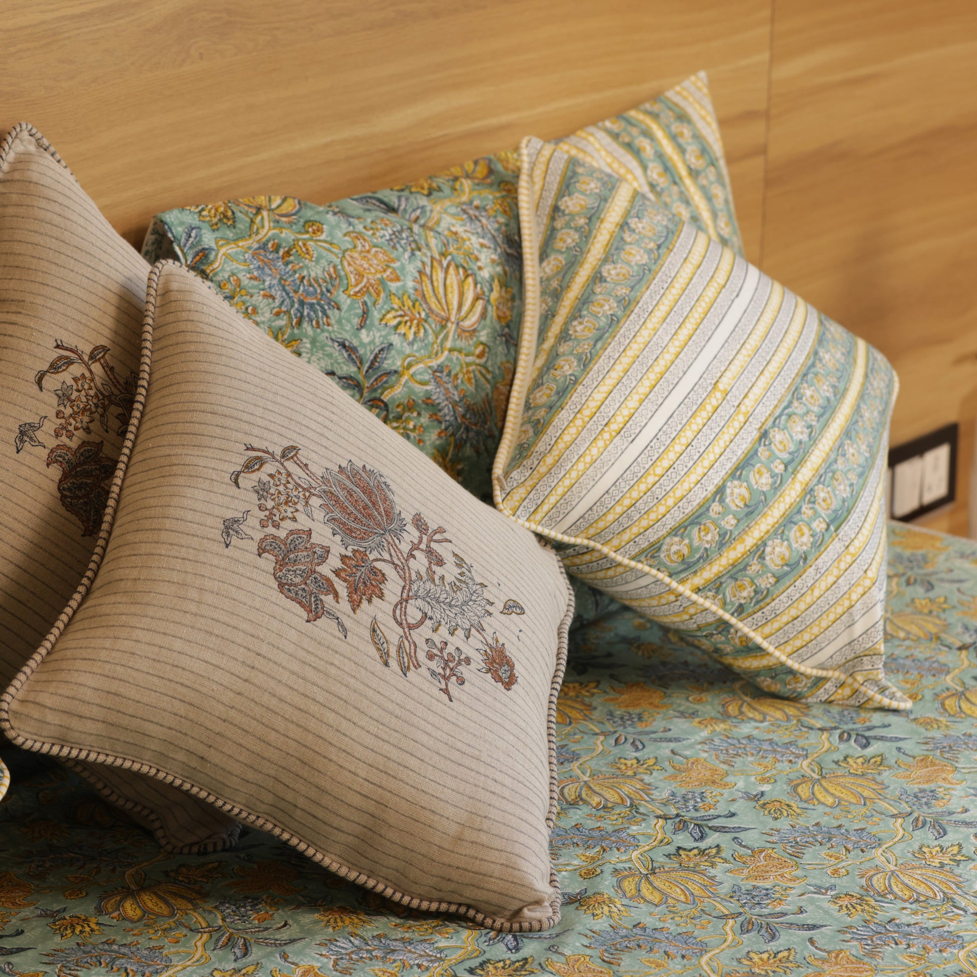 Elevate your bedroom with the Green Lotus Bedding Collection, thoughtfully curated with 8 essential pieces. This set includes a stylish bedcover, two pillow covers, a cozy quilt, and four cushion covers—two in soft cotton and two in durable linen. Designed to balance comfort and elegance, it offers versatility and a refined look while ensuring lasting quality. Ideal for creating a tranquil and inviting sleep environment, this collection blends texture and color harmoniously to enhance your bedroom decor.