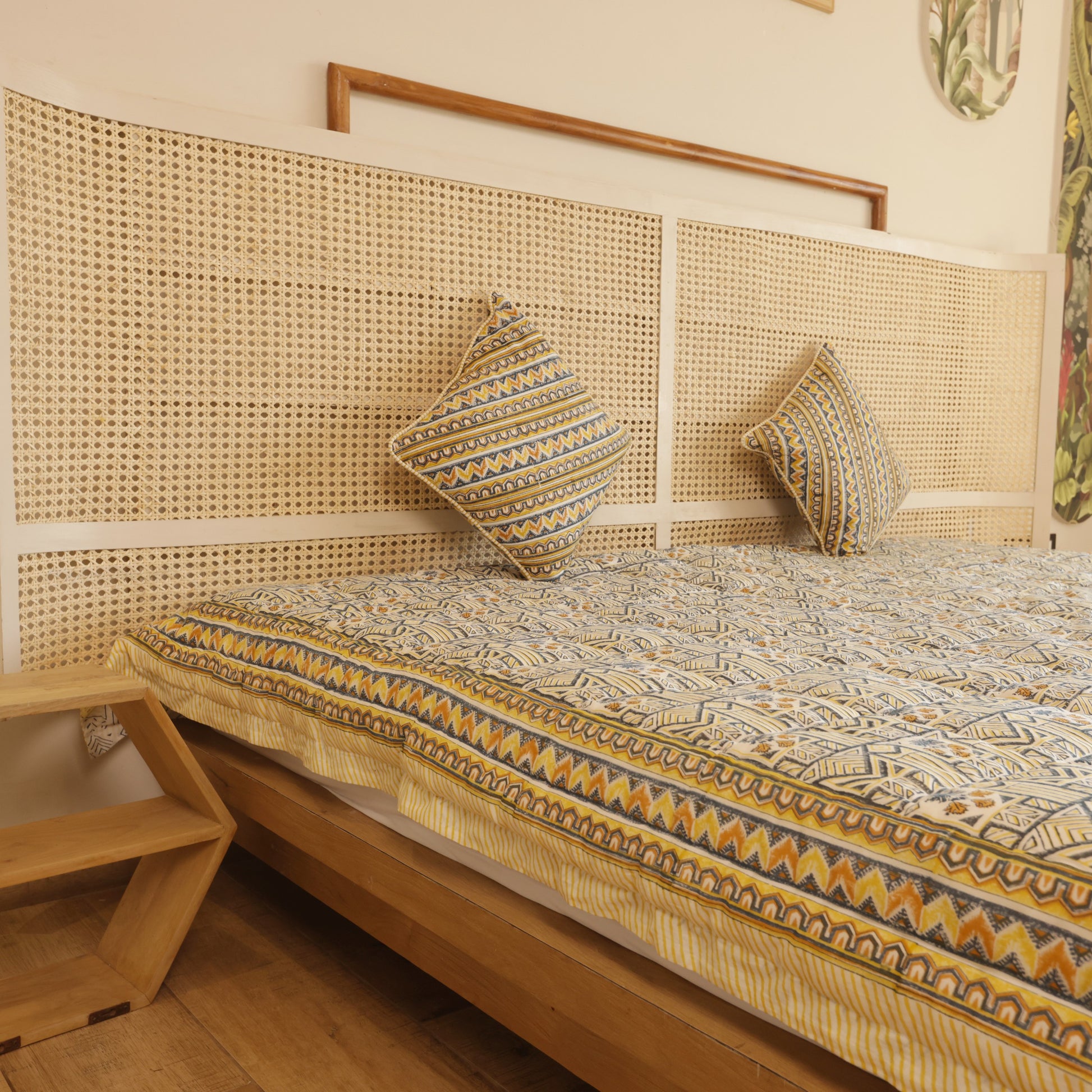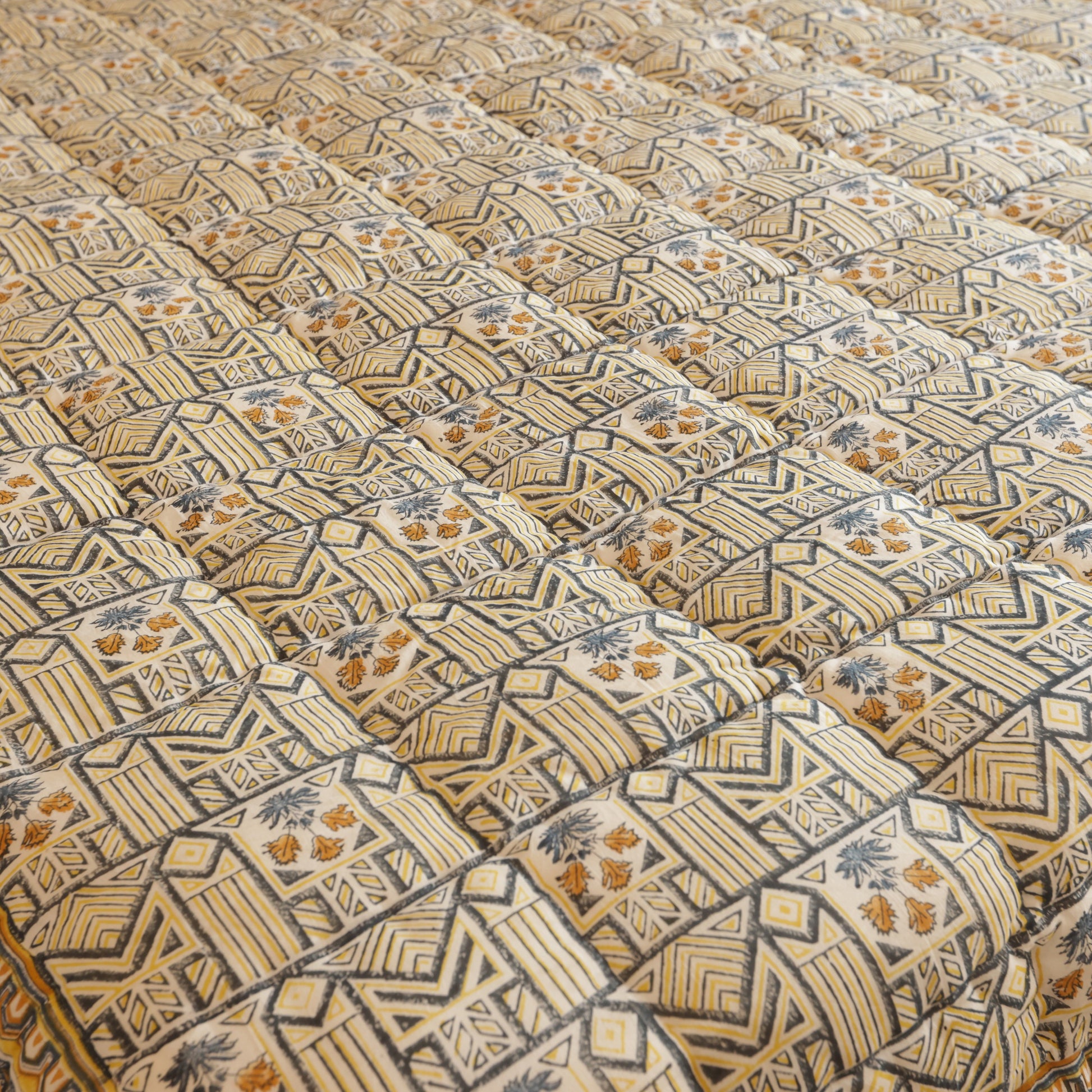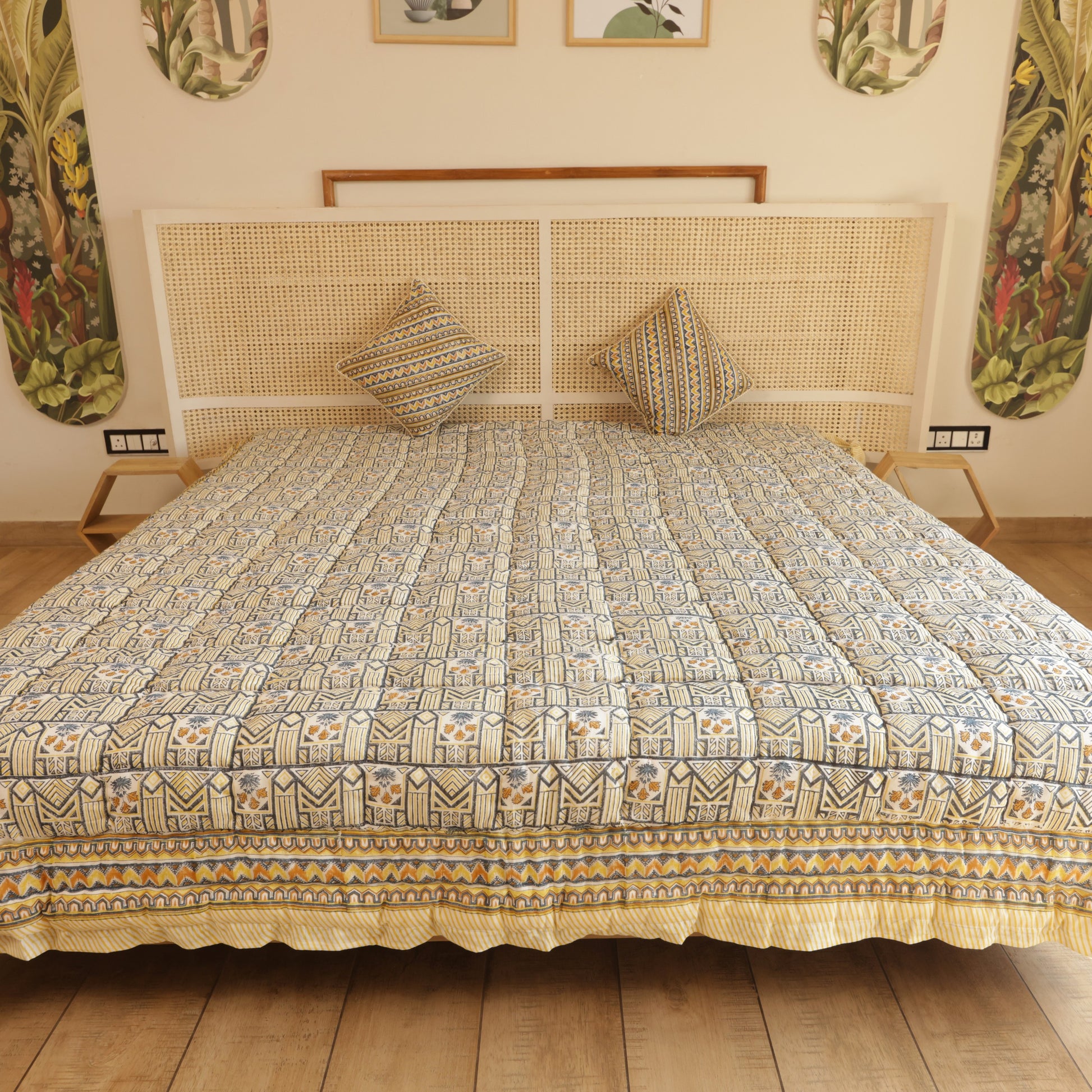 Experience the timeless elegance of the Tribal Bloom Quilt, expertly crafted in Jaipur. Made from pure cotton, this quilt offers breathable comfort for all seasons—warm in winter and refreshingly cool in summer. Rooted in heritage textile traditions, it reflects skilled artisan craftsmanship while seamlessly fitting into contemporary home décor. Durable and versatile, the Tribal Bloom Quilt enhances any space with its cultural richness and practical design.