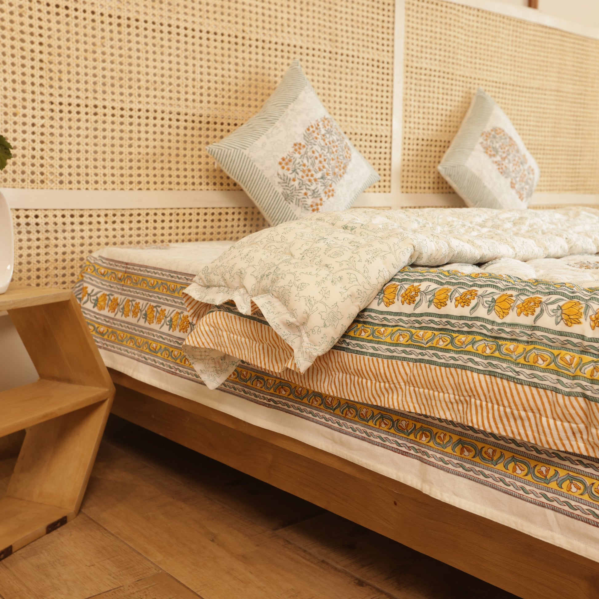 Traditional Cotton Quilt designed in Jaipur for year-round comfort. Pure cotton keeps you cosy in winters and cool in summers. A heritage textile that combines artisan skill with sustainable and versatile use in modern homes.
